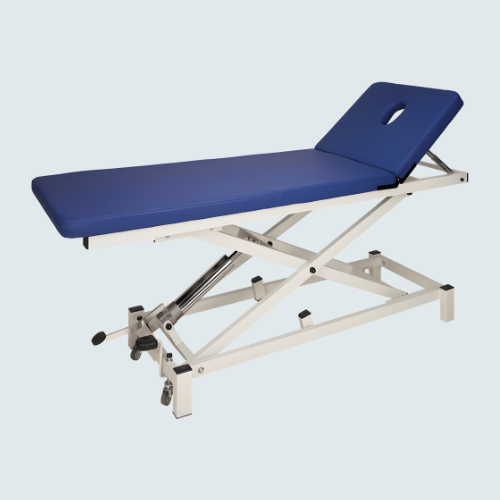 Camilla asistencial hidráulica con respaldo bidireccional y ruedas escamoteables