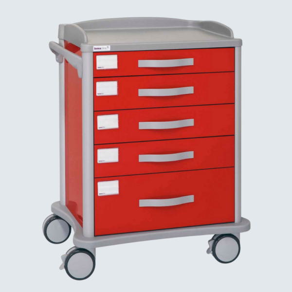 Equipado con cinco cajones con cestas ISO extraíbles, guías telescópicas con autocierre, empujador y ruedas giratorias con freno. Ideal para distintos usos clínicos y asistenciales.
