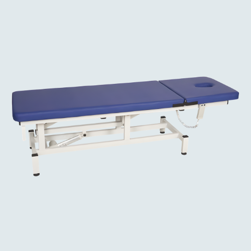Dispone de un sistema de elevación eléctrico accionado mediante mando de mano, que permite ajustar la altura de forma precisa y sin esfuerzo, facilitando el trabajo del profesional y mejorando la accesibilidad del paciente. Incorpora un motor Dewert con protección IPX4, asegurando un funcionamiento seguro y fiable.