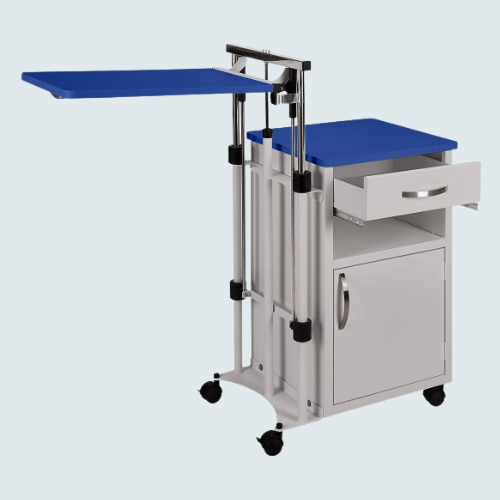 El atril o mesa de servicio está fabricado en acero inoxidable y es regulable en altura mediante pistón a gas, permitiendo un ajuste progresivo y preciso para adaptarse a diferentes usos, como alimentación, lectura o apoyo clínico.