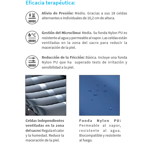 Dispone de terapia de presión alternante, mediante la cual las 18 celdas individuales se inflan y desinflan de forma secuencial cada 9,6 minutos, redistribuyendo la presión y mejorando la circulación sanguínea. Se trata de un sobrecolchón (requiere colchón base) con celdas de 10,2 cm de altura, cumpliendo las recomendaciones de la EPUAP (European Pressure Ulcer Advisory Panel).