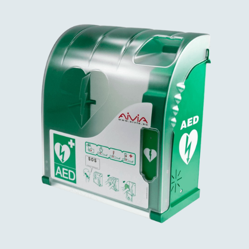 La Vitrina AIVIA 100 con pilas y alarma es una vitrina diseñada para la protección, señalización y acceso rápido a desfibriladores externos automáticos o semiautomáticos en espacios interiores. Su diseño combina robustez y ligereza, gracias a una estructura compuesta por cubierta de policarbonato y soporte de ABS, materiales ampliamente utilizados en distintos sectores por su elevada resistencia a impactos y durabilidad.